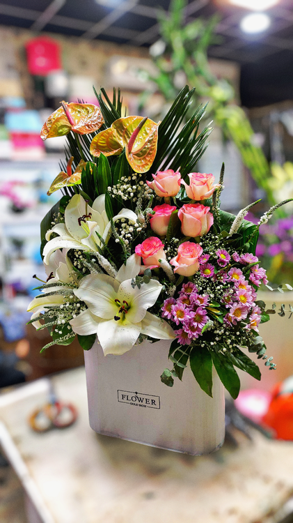 سبد گل لوکس با گلهای داوودی، رز و اوریانتال