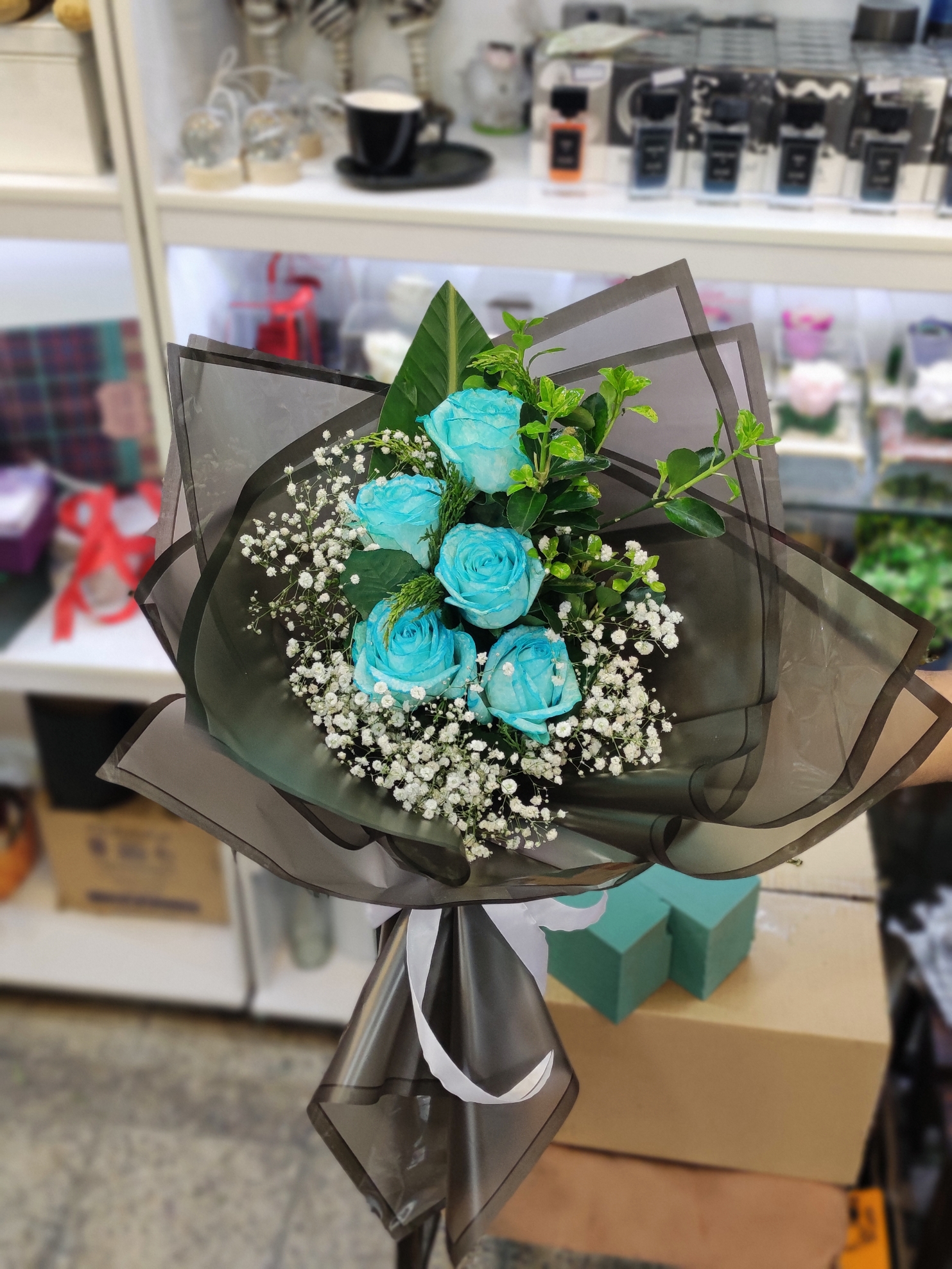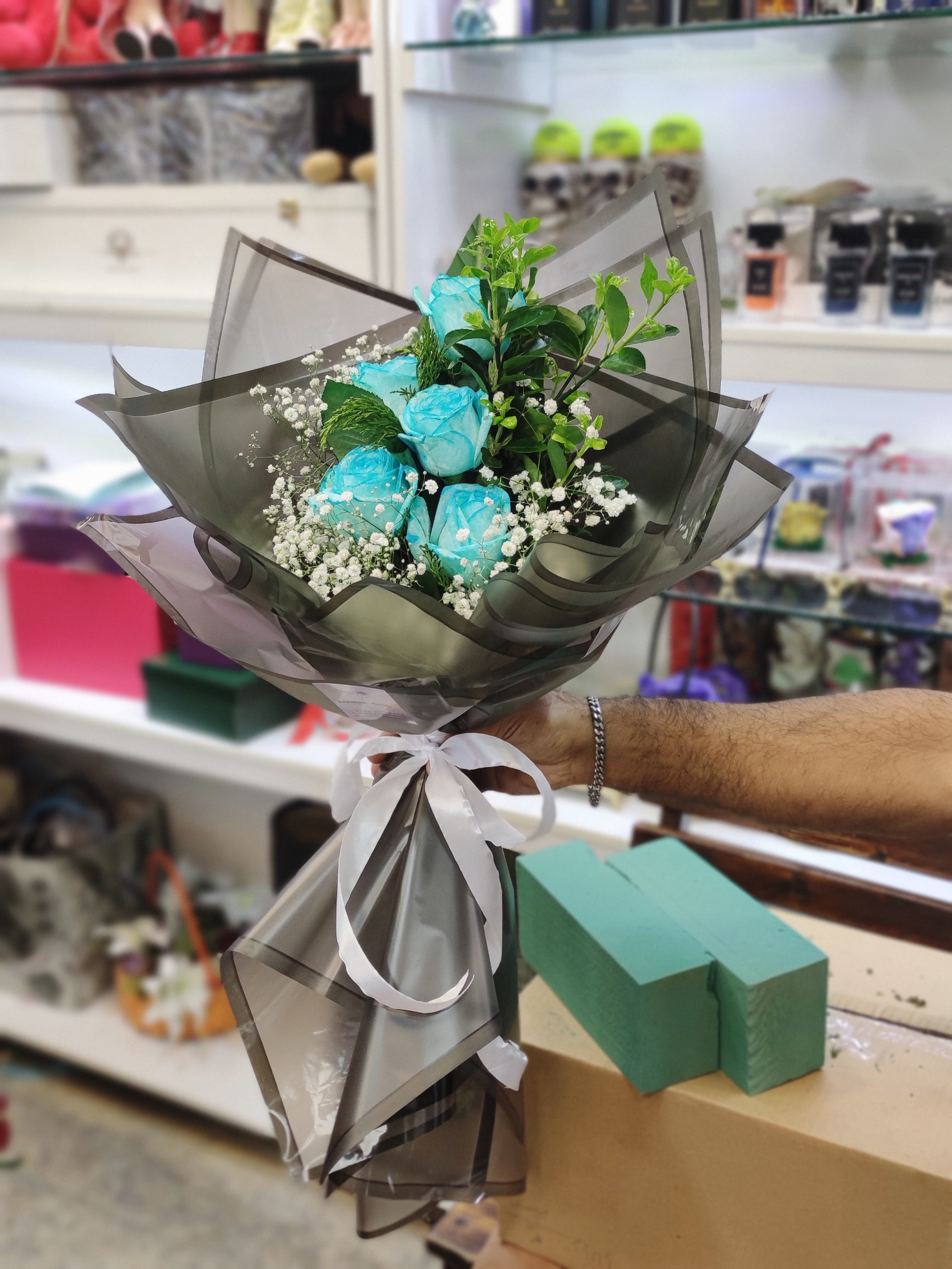 این دسته گل زیبا شامل ۵ شاخه رز آبی تازه و باکیفیت است که با تزیینی شیک و مدرن آماده شده است. رز آبی نماد آرامش و خاص بودن است و انتخابی عالی برای هدیه دادن در مناسبتهای خاص، تولد و سورپرایزهای عاشقانه محسوب میشود.