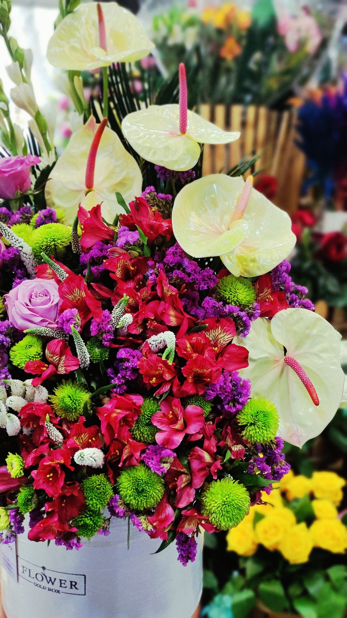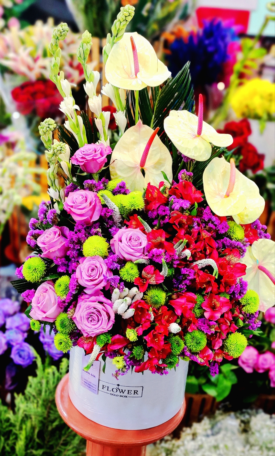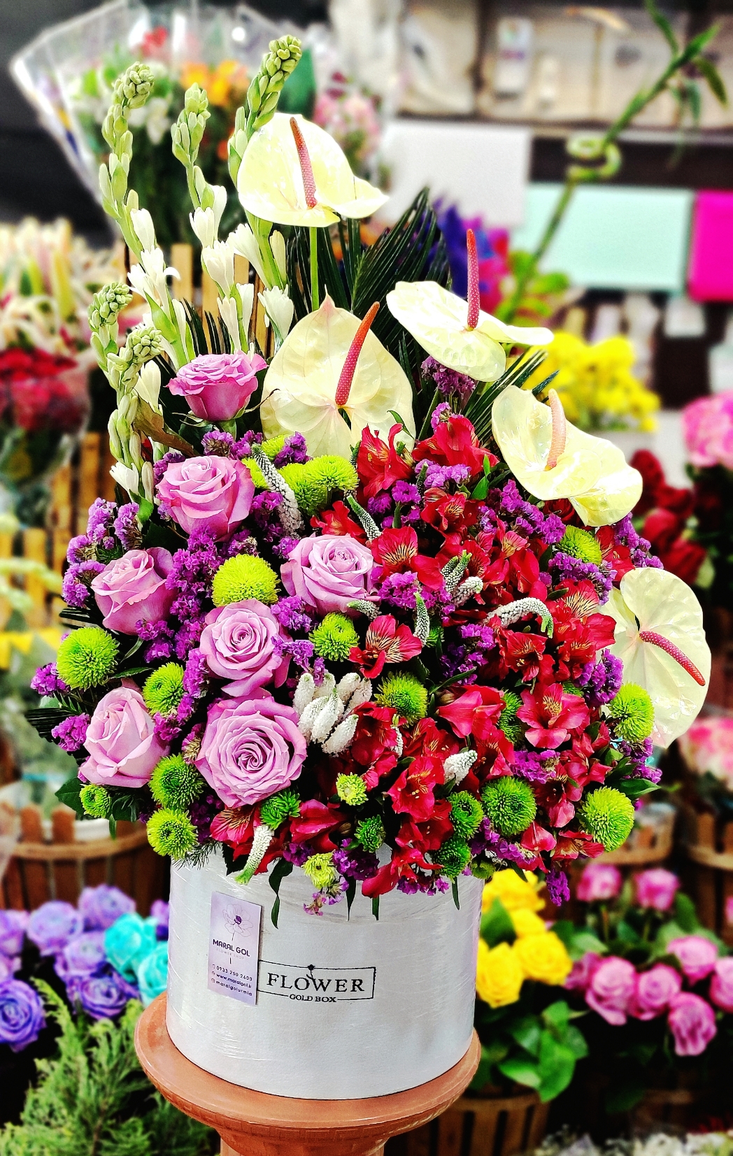 این باکس گل مجلل و زیبا، ترکیبی از گلهای آنتوریوم، رز و داوودی است که با چیدمانی هنرمندانه در یک باکس سفید شیک قرار گرفتهاند. این محصول انتخابی ایدهآل برای مراسمهای خاص مانند خواستگاری، هدیه تولد و سالگرد ازدواج است.